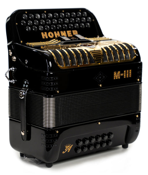 Hohner MARK III 3 Switch Compact Accordion - Black with carrying case. Key: E 3 Switch 34 Buttons Leather Straps Size: 13" X 7" Weight: 11.7 Lbs C...