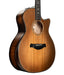 The Builder's Edition 614ce features the popular Grand Auditorium body, a torrefied Sitka spruce top, back and sides of figured Big Leaf maple, and our patented V-Class bracing. That combination yields an ultra-responsive, player-reflective sound, elevating maple's natural transparency in a way that can sound warm, bright or whatever a player's hands decide. The V-Class architecture improves the volume, sustain and projection, and creates more harmonic agreement between notes by putting the top more in tune with the strings. Our proprietary roasting process for the Sitka spruce top lowers the damping effect and helps deliver a more played-in tone. Ergonomic body details (exclusive to Builder's Edition) include a beveled armrest with beveled body edge treatment; a double-carved cutaway that allows fluid access to the higher frets without the need to change one's hand position; and the new Silent Satin finish, which reduces contact noise for a cleaner overall sound. Gold Gotoh 510 tuners (featuring a 21:1 gear ratio) complete the suite of tactile delights. Striking aesthetic details include a new Wild Honey Burst on the back, sides and neck (an optional burst-top version is also available), a mother-of-pearl Sceptor fretboard/peghead inlay, and inset maple/black body purfling with matching rosette. The guitar comes equipped with the ES2 electronics and ships in a deluxe hard-shell case.