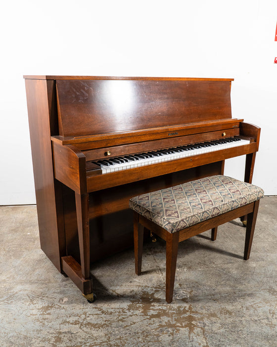 This particular piano, serial number 401108, was built in the United States in the mid‑1980s and comes with a matching bench. Standing 45" tall, the 243 model features a solid spruce soundboard, a robust action mechanism, and a traditional institutional cabinet style designed for longevity and stability.