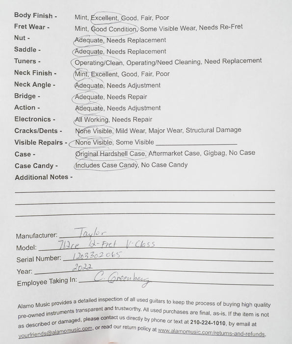 Alamo Music provides a detailed inspection of all used guitars to keep the process of buying high quality pre-owned instruments transparent and trustworthy. All used purchases are final, as-is. If the item is not as described or damaged, please contact us directly by phone or text at 210-224-1010, by email at yourfriends@alamomusic.com, or read our return policy at www.alamomusic.com/returns-and-refunds.