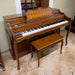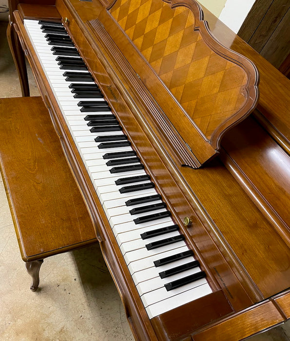 Spinet pianos are perfect for a player from beginner to intermediate, especially one looking to upgrade from a digital piano or keyboard. The spinet is a vertical piano, and while it is the smallest in its class, its action is a substantial upgrade from a keyboard. The drawbacks come in its acoustics, due to its shorter string length in relation to larger upright pianos; however, a spinet piano is a great choice for anyone looking to take the step into acoustic pianos.