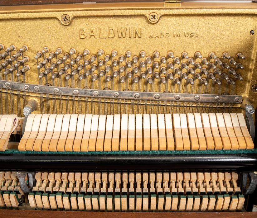 The Baldwin 243 studio is the single most popular piano model that Baldwin has ever produced. It has been a favorite piano model among home pianists, teachers, music departments of colleges, school systems, and houses of worship for many years. This Baldwin Model 243 features a 47″ height that allows for a larger soundboard and a longer string length equivalent to a 5'8″ grand piano. This instrument has a big sound and projection and it is a wonderful choice for any piano player. This Baldwin "Hamilton" instrument is known for its 19-ply pin-block that adds tuning stability, the "full-blow" action with larger parts adding to faster repetition, and a solid spruce soundboard for tonal richness and projection.