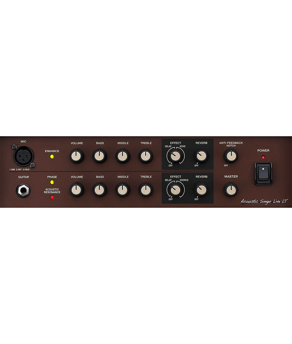 The Acoustic Singer Live LT offers simplified operation for players who don't need the looper and harmony features found in other Acoustic Singer amps. Dual channels allow you to connect an acoustic/electric guitar and a vocal mic, complete with dedicated EQ and effects for independent sound shaping. Also, via the loaded rear panel, you can interface with PA systems, music players, computers, and more.
