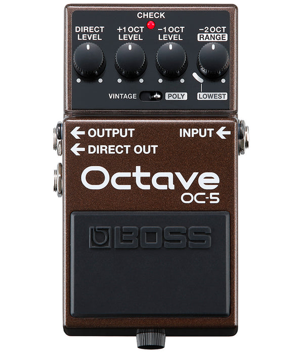 The BOSS OC-5 sets a new standard in octave pedal performance and fuses classic BOSS octave tones with the latest tracking technologies. Vintage mode provides a spot-on recreation of the legendary mono OC-2 from 1982, while Poly mode offers numerous enhancements for extended-range playing. And with the addition of an octave-up feature, a span of three octaves is now available for creative exploration. From fat, low mono sounds to octave-shifted chords and more, the OC-5 delivers the widest range, finest sound quality, and best playability in any octave stomp to date.