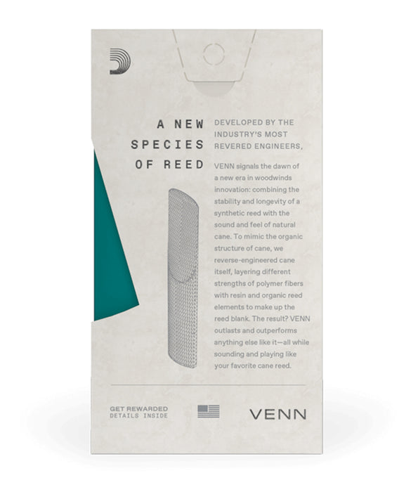 D'Addario VENN is an advanced synthetic reed constructed of polymer fibers, resin, and natural cane elements. VENN was designed to give players the benefits of synthetic reeds without compromising on the sound and playability of cane reeds.