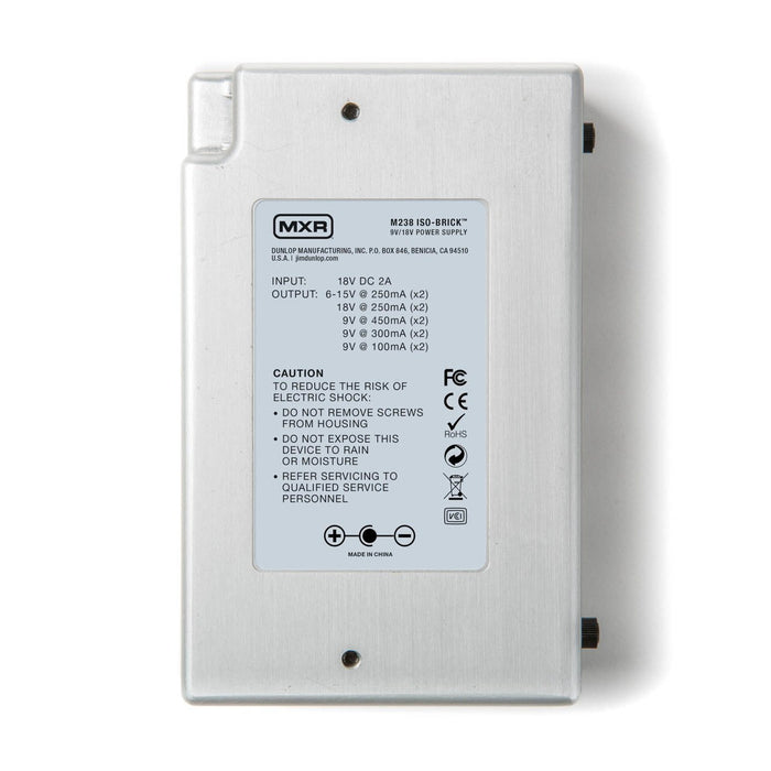 Each of the Iso-Brick Power Supply's 10 outputs is fully isolated, eliminating gig-ending ground loop noise. Whether analog or digital, positive or negative ground, this power box has you covered. The MXR team broke down these 10 outputs to accommodate a variety of voltage and current requirements: two 9V outputs at 100mA, two 9V outputs at 300mA, two 9V outputs at 450mA, two 18V outputs at 250mA, and two variable outputs adjustable from 6V to 15V at 250mA. The two variable outputs can be used to emulate voltage, drained battery effect sought by many vintage tonechasers.