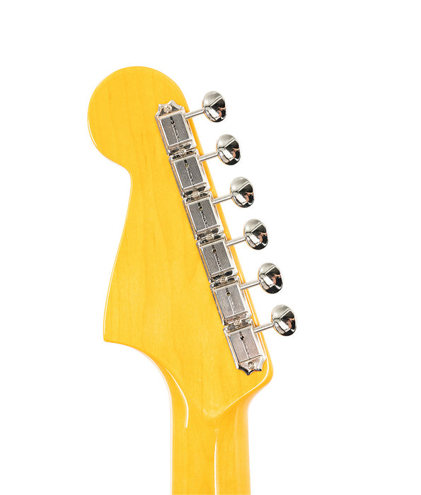 The American Vintage II 1966 Jazzmaster features a comfortable "C" shape maple neck that plays like a dream with a 7.25" radius round-lam rosewood fingerboard and vintage tall frets. Characteristic of production in 1966, this guitar is offered with white neck binding, pearl blocks, single-line "Fender Deluxe" tuners. The patented "floating" tremolo, adjustable bridge with threaded saddles and Pure Vintage '66 Jazzmaster pickups, wired to the signature rhythm and lead circuits, deliver classic tone and authentic Fender feel.