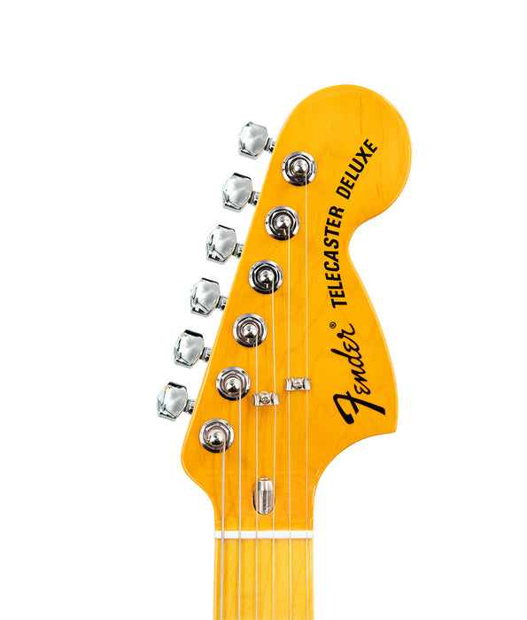 Featuring a '75 "C"-shape hard rock maple neck, the American Vintage II 1975 Telecaster Deluxe plays like a dream with a 9.5" radius maple fingerboard and medium jumbo frets. Characteristic of production in 1975, this Telecaster is outfitted with a convenient "Bullet" style truss rod nut, three-bolt neck plate with Micro-Tilt mechanism and offered in Black, Mocha Brown, or 3-Color Sunburst over an alder body. Other features include a 6-Saddle hardtail bridge with stainless steel block saddles and vintage-accurate Tele Deluxe tuners.