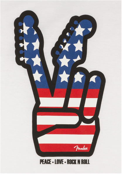 Show your love for Fender and America with this raglan T-Shirt. Sporting a fanciful peace sign graphic with Stratocaster® and Telecaster® headstocks, in the colors of the American flag, this T-Shirt is just the thing for backyard barbecues.
