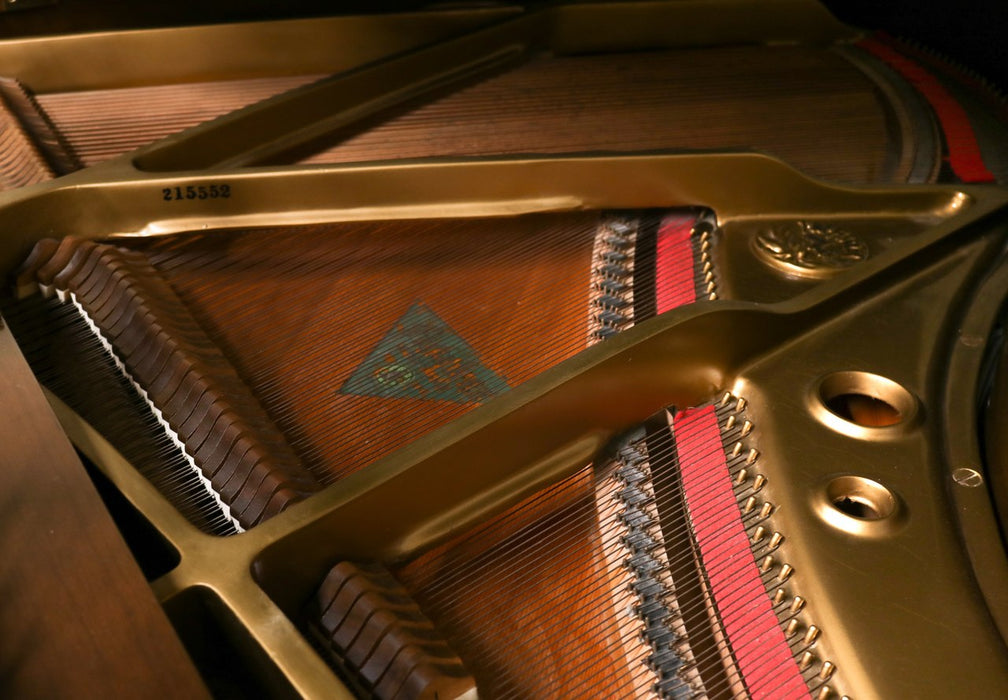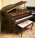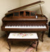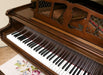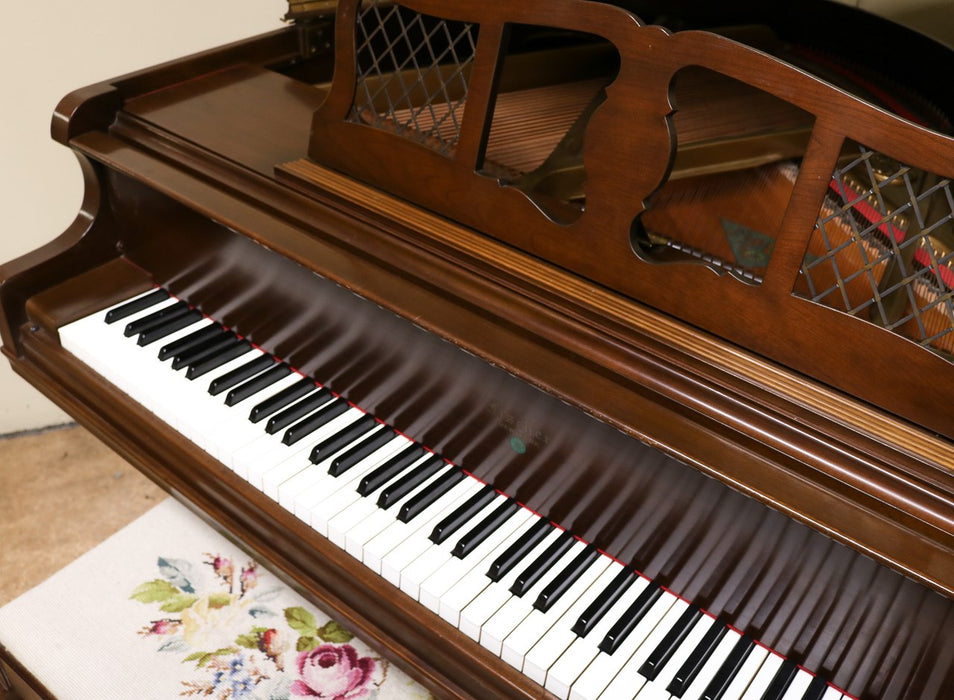 This beautiful Fischer grand piano in dark Mahogany is a Queen Anne style finish with a matching needlepoint/embroidered bench cover. This instrument features a round warm tone, desirable touch and action along with a very attractive cabinet. The smaller stature will make an excellent first grand piano for someone, whether they're a beginner, or returning adult looking to add a piano to their home.