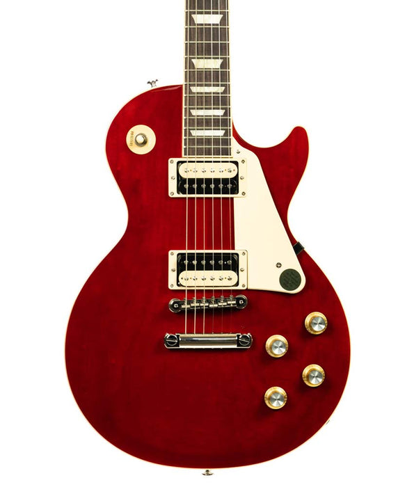Strap on Gibson's Les Paul Classic, and you'll experience iconic tone and uncompromising playability. A time-tested combination of maple and mahogany serves up the tone that's fueled a million rock anthems, while Burstbucker pickups inject your playing with loads of midrange muscle and sizzling overtones. You also get coil tapping, phase reversal, and pure bypass options for an endless variety of tonal textures. As for playing comfort, this Les Paul feels as amazing as it sounds, thanks to a SlimTaper neck and easy-playing rosewood fingerboard. The Les Paul Classic includes a self-lubricating Graph Tech nut, Tune-o-matic bridge, vintage-style Grover Rotomatic tuners, and gold top hat knobs.
