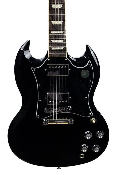 The Gibson SG Standard rocks the classic looks and features associated with the late 60's style SG models sought after by many. A rounded profile mahogany neck, bound rosewood fingerboard, long tenon 19th fret neck joint, and a solid mahogany body provide the backbone for singing sustain. The 490R and 490T Alnico II pickups provide the power to drive. A black, 5-ply, full-face pickguard set this SG Standard apart from others... a truly versatile classic.