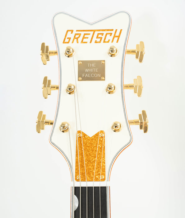 Authentically iconic, this striking guitar displays gold hardware - including the gold jeweled G-arrow knobs - gold sparkle bound neck, body and F-holes, vintage white gloss nitrocellulose lacquer finish and gold vintage thick plexi pickguard with Gretsch logo. With its stunning looks and huge sound, the iconic G6136T-59 Vintage Select Edition '59 Falcon™ Hollow Body with Bigsby® is the crown jewel of Gretsch guitars. Includes a deluxe hardshell case.