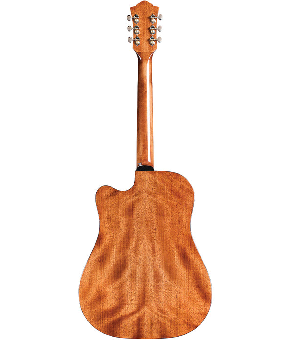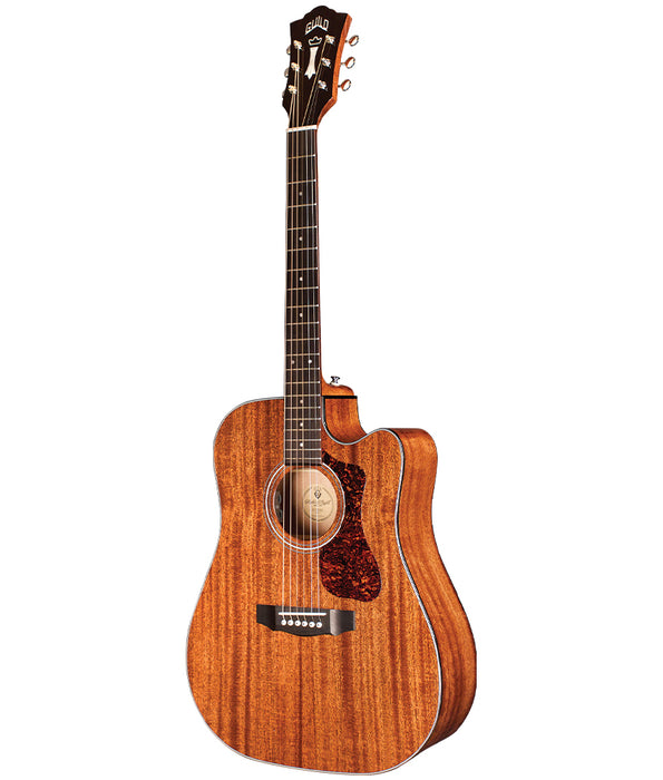 The D-120CE is a Guild dreadnought with full-bodied and powerful tone that provides guitarists with a classic acoustic sound and balanced voicing. Built with solid African mahogany top, back and sides, the D-120CE also features an elegant cutaway for access to higher frets, and a hidden Guild/Fishman AP1 with Sonicore pickup. Additional features include a bone nut and saddle and period-correct tortoiseshell pickguard. A mother-of-pearl rosette and Guild's iconic Chesterfield headstock emblem reminiscent of 1960s models complete the package.