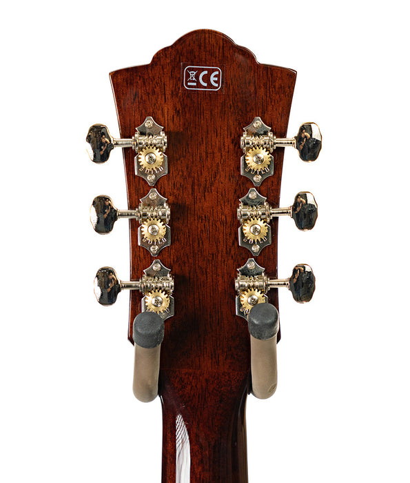The D-140CE is dreadnought with a full-bodied and powerful tone that provides guitarists with a classic acoustic sound and balanced voicing. Built with a solid Sitka spruce top and solid African mahogany back and sides. The D-140CE also features an elegant cutaway for access to higher frets, and a hidden Guild/Fishman AP1 with Sonicore pickup. Additional features include a bone nut and saddle, and period-correct tortoiseshell pickguard. A mother-of-pearl rosette and Guild's iconic Chesterfield headstock emblem reminiscent of 1960s models complete the package.
