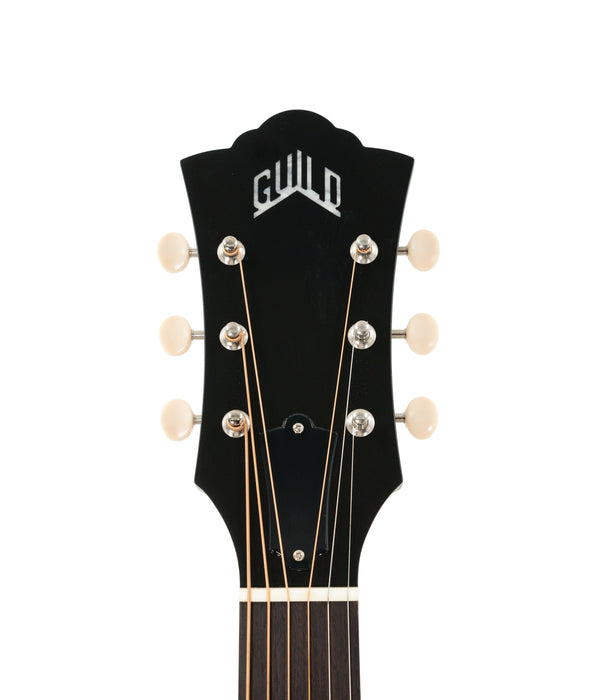 The Guild F-40 Standard is a Jumbo body acoustic guitar featuring vintage gloss, a mortise & tenon neck joint, and pearloid inlays.