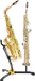 The HERCULES Saxophone Multi-Stand DS533BB features a folding yoke, an adjustable backrest, and locking pins that all safely and securely hold a Tenor or Alto Saxophone; includes an additional peg for a Soprano Saxophone.