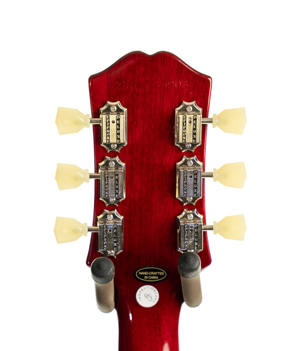 Epiphone's new Inspired by Gibson Collection presents the Les Paul Standard 50s inspired by 1950s era Les Pauls. The guitar is crafted with a mahogany body, maple cap AAA veneer, bound 50s shaped mahogany neck with long neck tenon, Indian laurel fingerboard with classic trapezoid inlays, Epiphone's new Vintage Deluxe tuners, a pair of critically acclaimed Epiphone ProBucker humbuckers, and gold Top Hat knobs with dial pointers. This Epiphone Inspired by Gibson Original model also has the Kalamazoo headstock, rolled neck for a comfortable feel, Graph Tech NuBone nut, era-appropriate wiring, and CTS pots.