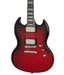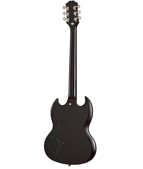 The Epiphone Prophecy SG brings high-performance features to the classic SG design, making it an excellent choice for today's progressive guitarists. The mahogany body is topped with a 3/4" maple cap and beautiful AAA flame maple veneer on a Red Tiger Aged Gloss finish. The SlimTaper asymmetrical mahogany neck features a 24 fret ebony fingerboard with jumbo frets, Block and Triangle pearloid/abalone inlays with abalone selected to complement the body color, brushed nickel Grover Locking Rotomatic tuners, and a black Graph Tech NuBone nut.