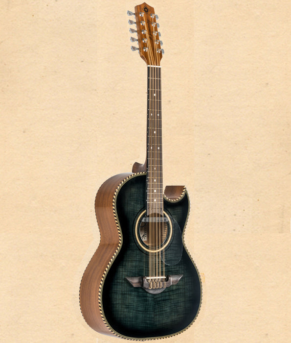 El Esta'ndar - LBQ1EBF H. Jimenez bajo quinto features a flame maple top and a pickup with a volume control. It has a cutaway with resonate mahogany back and sides with no micas. It has a comfortable low profile neck with an adjustable truss rod and signature "Thunderwing" bridge and lifetime warranty.