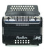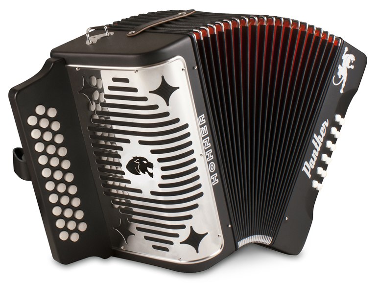 The Hohner Panther GCF Diatonic Accordion shares many of the quality features of our more expensive diatonics with a lower price tag. The Panther Accordion features double-strap brackets, 31 treble keys, 12 bass/chord buttons and 2 sets of treble reeds. The Hohner Panther Accordion is 12" high x 7-1/2" deep and weighs 9 pounds. Plays in keys of G, C, and F.