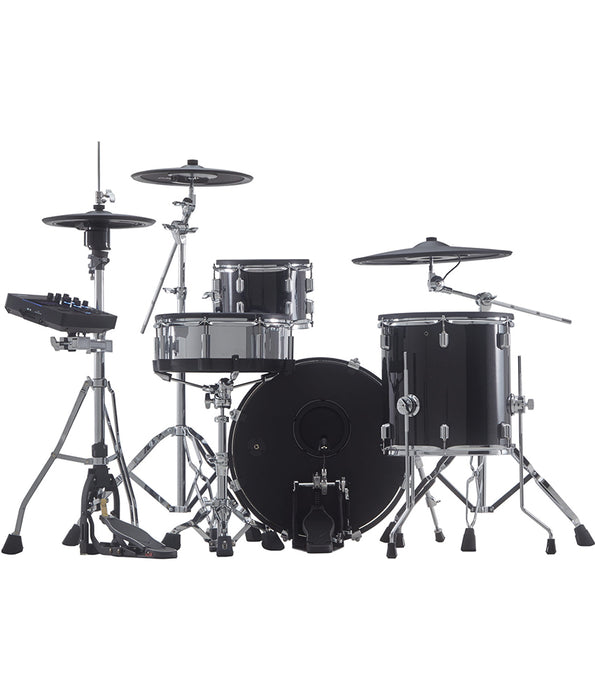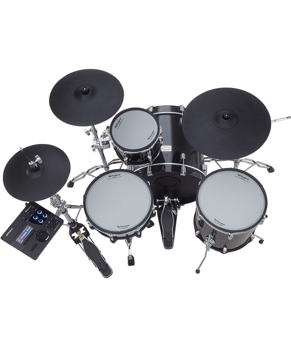 The VAD503 is a premium 'one-up, one-down' kit features wooden shells with full depth and diameter, exquisitely finished and mounted on double-braced chrome stands for a look that will have the audience convinced you're playing acoustic drums. Roland's advanced digital sensor technology and dynamic TD-27 drum module provide the sound and response to match, making sure every stroke, ghost note, roll, and swell is fully expressed in incredible detail.
