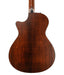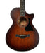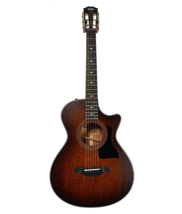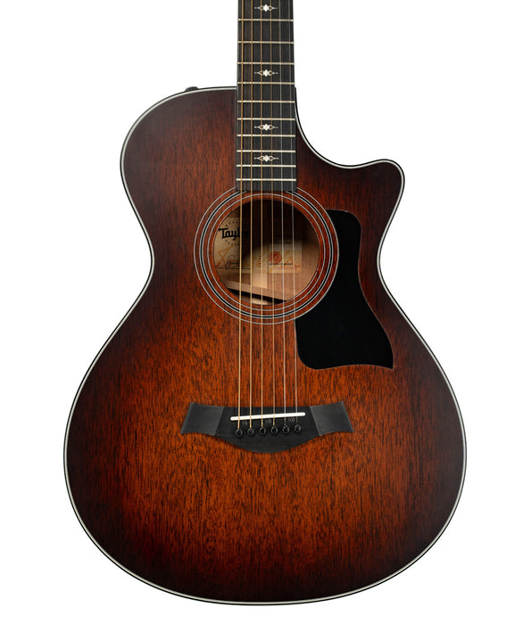 This mahogany-top cutaway Grand Concert 322ce is a unique transition model from Taylor guitars. An early serial number from 2019, it features a solid mahogany top with an edgeburst finish but tazmanian blackwood back and sides that had the previous years model while still featuring V-class bracing. The vie of this guitar will appeal to rootsy fingerstyle players craving a comfortable playing experience. The 24-7/8-inch neck makes fretting and bending strings easier, while the blackwood/mahogany wood pairing yields a surprisingly warm and dynamic tonal response for a smaller body. A smooth shaded edgeburst adds a tasteful vintage look that complements the rich-grained mahogany top. Appointments include a black pickguard,faux pearl gemstone fretboard inlays, black binding with crisp white top trim, 3-ring rosette, and satin finish. The guitar comes equipped with a Venetian cutaway and Expression System 2 electronics for organic plugged-in acoustic tone.