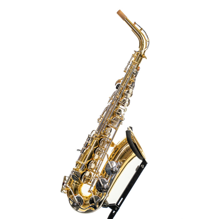 Nickel-plated keys, adjustable thumb rest, improved low B-C# connection, and a durable plastic case make this the perfect beginning rental alto saxophone.