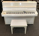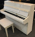 Samick S100S White Upright manufactured 1989 beautiful Polished White Euro Style cabinet with matching bench. Piano has excellent action, balanced and consistent throughout along with a nice tone. Euro Style pianos generally pack a lot of punch because of the larger than spinet size, smaller than console furniture pianos; they are like a bare bones performing instrument without much ornamentation or decoration. The simple aesthetic design reinforces the instruments essentials: Frame; soundboard; solid key-bed and keys; excellent action; reinforced back; frame and polished ebony cover. It is perfectly balanced, even without the space taking "front legs" of a normal upright piano. Perfect piano for any level player from professional to beginner this is perfectly functioning lovable instrument with a wide range of expression, sound and response to player. Comes complete with a matching bench and FREE local delivery!