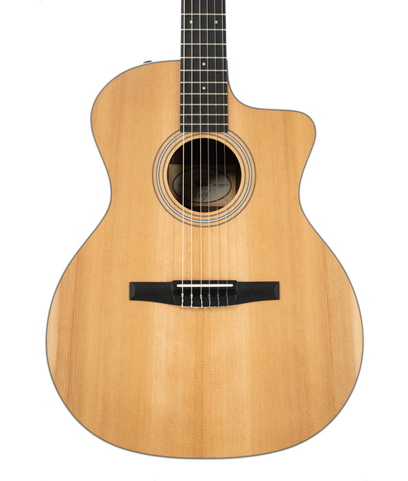 This Nylon-string guitars offer a sonic tool with a distinctive voice that can open new stylistic possibilities. The Taylor 214ce-N produces all the classically warm, snappy nylon vibes of a traditional classical instrument, with a feel that will seem like a natural transition for players accustomed to steel-string acoustic guitars. Layered Indian rosewood back and sides provide stability and a balanced musical response, while the solid spruce top adds punchy projection. Standard appointments include white binding and three-ring rosette, plus 4mm dot inlays in Italian acrylic and a traditional slotted headstock.