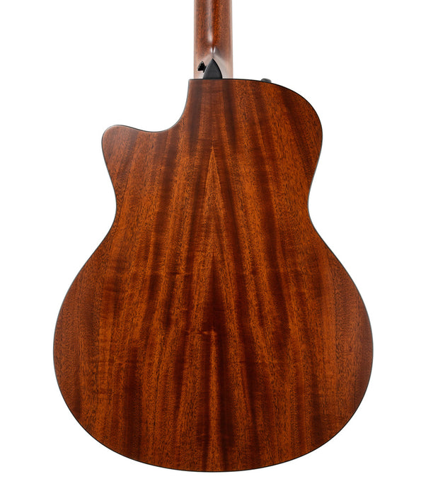 Taylor's new 326ce Baritone-6 Special Edition reintroduces players to a truly singular playing experience that bridges the gap between traditional acoustic sounds and specialized tonal flavors. The 326ce Baritone-6 Special Edition boasts back, sides and top of solid neo-tropical mahogany crafted in Taylor's bold-voiced Grand Symphony body shape, yielding a haymaker of midrange punch that retains exceptional focus alongside its powerful attack. Perfect for any player looking to diversify their musical toolkit, this model will be especially inspiring for guitarists who enjoy experimenting with uncommon sonic palettes. It can also be a useful tool for singers, providing a frequency spectrum that might be more accessible for those with a lower vocal range. Placing a capo at the fifth fret returns the guitar to standard tuning. Visual appointments include a satin finish with a dark stain and a shaded edgeburst top treatment, black binding with a matching three-ring rosette and pickguard, Gemstone fretboard inlays in Italian acrylic, and satin black tuners. It also features a traditional Venetian cutaway for easy access to the guitar's upper register, along with ES2 electronics for faithful amplified tone.
