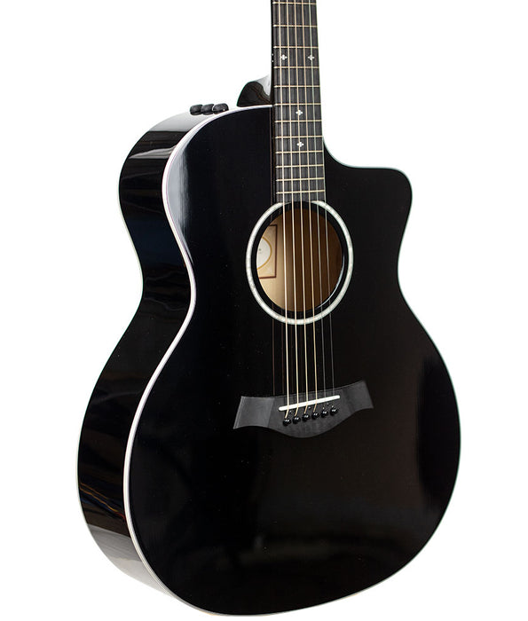Crisp white binding on a full-gloss, all-black body highlights the contours of this eye-catching all-black 200 Series Deluxe Grand Auditorium. A solid Sitka spruce top helps project clear, balanced tone, and a Venetian cutaway broadens your tonal range by offering easy access to the upper register. When you're ready to plug in, Taylor's proprietary Expression System electronics will respond with articulate amplified tone.