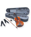 Outfit: Yamaha dart-shaped cloth-covered case with backpack-style shoulder straps. Includes Pirastro Schwarz rosin, Brazilwood bow and D'Addario Helicore strings.